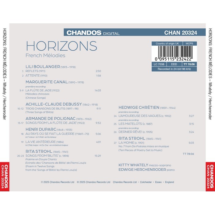 The mezzo-soprano Kitty Whately and pianist Edwige Herchenroder present a programme of French melodies from a range of composers, all based in Paris at the turn of the twentieth century. This was an exciting and stimulating time in the city, when the country was experiencing a surge of national confidence and creativity, and events such as the 1889 Exposition Universelle, broadened both geographical and cultural horizons. The women's movement flourished concurrently, ushering in new – if still unequal – educational and professional opportunities. The songs included on the album reflect these new horizons in a number of ways. The majority were composed by female composers and share popular contemporary sources such as Songs of Bilitis (a collection of erotic, essentially lesbian poetry by Pierre Louÿs, published in Paris in 1894) and Franz Toussaint's La Flute de jade (The Jade Flute), a French translation of an anthology of Chinese poems. The album contains four premiere recordings – three songs by Hedwige Chretien, and Marguerite Canal's settings of seven songs from La Flute de jade.