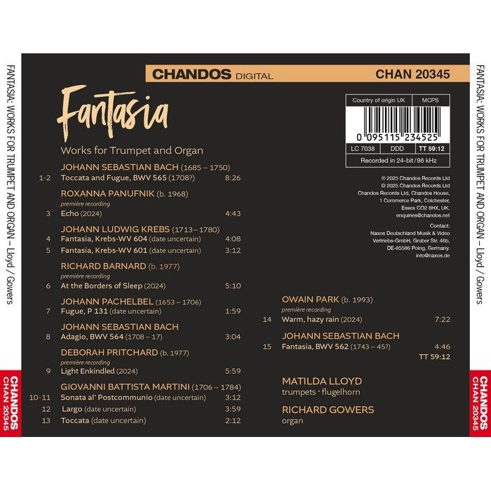 Matilda Lloyd and Richard Gowers, recital partners for more than a decade, present a diverse programme of music for trumpet and organ. Transcriptions of baroque works are interspersed with four world-premiere recordings of new works by British composers commissioned for the album. Matilda writes: 'Welcome to our world of Fantasia – an imaginative exploration of the long-established combination of trumpet and organ. Featuring five types of trumpet in seven different keys and the newly refurbished organ of the Abbey Church at Waltham Abbey, this album explores a myriad of sounds that will ignite the imagination and enchant the ear!'