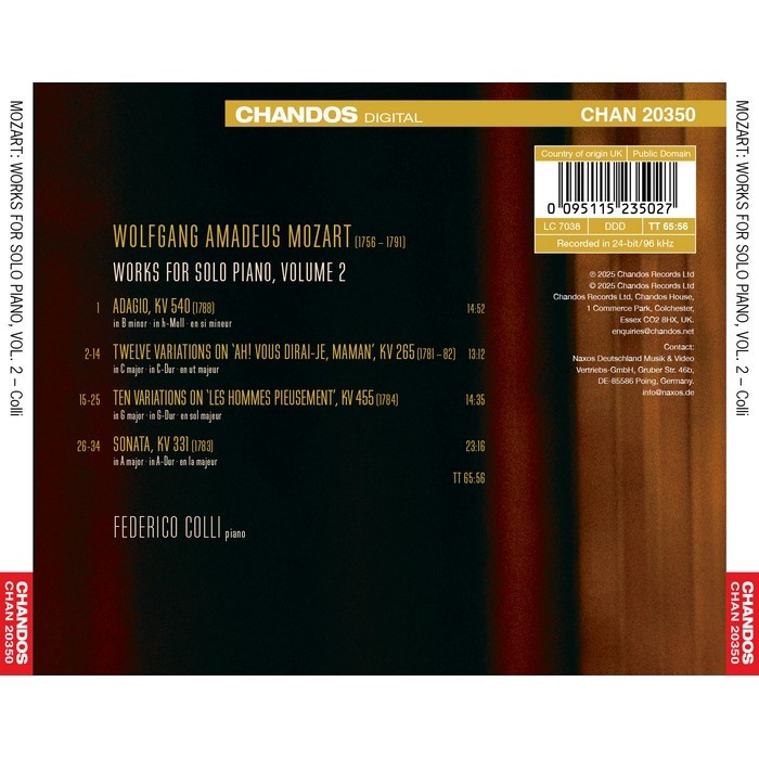 International sensation Federico Colli continues his personal exploration of the music of Mozart with this second volume of works for solo piano. Colli opens his programme with the Adagio in B minor, K. 540, from 1788, toward the end of Mozart's short life. The only piece on the album not to involve variation form, this Adagio instead adopts sonata form, and is an extremely rare case in Mozart's output of its chosen key. The two sets of variations that follow (from the seventeen sets that Mozart composed) use a similar approach in their method of constructing variations on the theme – 'Twinkle, Twinkle, Little Star' in the first instance, and Gluck's smash hit 'Les Hommes pieusement' (or 'Unser dummer Pobel meint') in the second. Colli concludes his programme with the rather extraordinary Sonata in A major, K. 311. Instead of the expected sonata form, the first movement is a theme with (six) variations. Following the second movement (a minuet and trio), Mozart finishes with a rondo – arguably one of his most famous pieces, the 'Alla turca'.