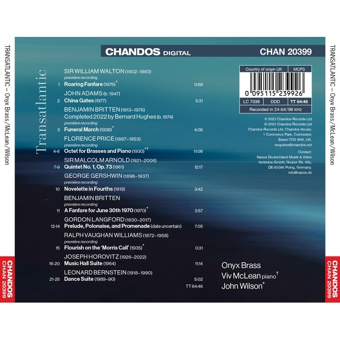 This album combines pieces for the core quintet of Onyx Brass with works for extended brass forces, plus piano in the case of Florence Price's Octet for Brasses and Piano. The majority of the pieces here receive their first commercial recording, the two Britten premieres bringing two long-forgotten pieces out of the Britten Pears Archive, in Aldeburgh, into the sunlight. Alongside these new discoveries are performances of established favourites by Sir Malcolm Arnold and Joseph Horovitz, staples of the brass chamber repertoire for more than half a century. The selection of composers spanning most of the twentieth century, and from both sides of the Atlantic, gives the album a refreshing contrast of musical traditions and styles. Founded in 1993, and initially inspired by the pioneering early years of the Philip Jones Brass Ensemble, Onyx Brass remains a leading light in cementing the place of the brass quintet as a medium for serious chamber music. To this end, the group has commissioned and performed the world premieres of more than 200 new works; many more are in the pipeline for performance and recording.