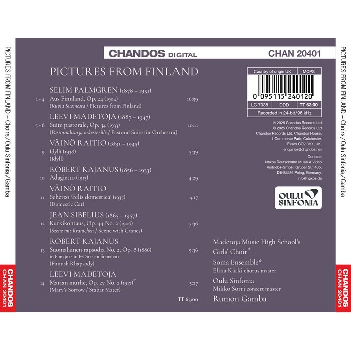 Following their successful album Overtures from Finland (CHSA 5336), Rumon Gamba and Oulu Sinfonia present another programme of works from their native land. The album takes its title from Selim Palmgren's four-movement suite, written in 1904, offering richly atmospheric character pieces celebrating the changing seasons. Several of the works here take inspiration from the natural world, not least Kurkikohtaus (Scene with Cranes) which Sibelius composed as incidental music for a play by his brother-in-law, Arvid Jarnefelt. Robert Kajanus is often considered the father of Finnish music. As a young man, he was one of the standard bearers in the drive for Finnish independence, and he developed a keen artistic interest in Finnish folklore and vernacular traditions. His Second Finnish Rhapsody (Suomalainen rapsodia), Op. 8, dates from 1886 and is the oldest work here. The album also features works by two further key Finnish composers: Vaino Raitio and Leevi Madetoja – the latter a native of Oulu. Taken as a whole, the album presents its own fascinating picture of Finnish orchestral music.