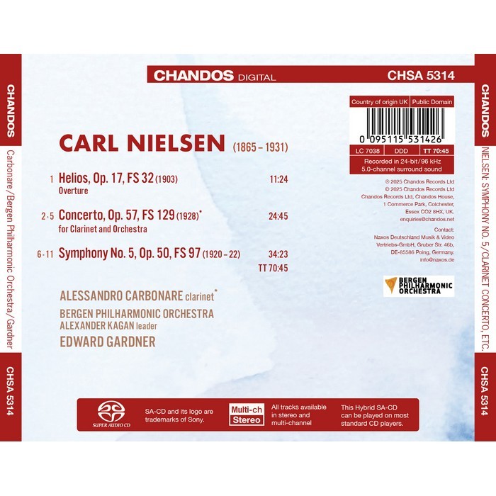 Edward Gardner's series of Nielsen symphonies with the Bergen Philharmonic Orchestra continues with this recording of No. 5, complemented with the overture Helios and the Clarinet Concerto, featuring Alessandro Carbonare as soloist. Nielsen composed Helios in 1903 on a trip to Greece, as his wife, Anne Marie, a sculptor, had won a grant to copy sculptures on the Acropolis. Over its ten-twelve-minute duration, the work depicts sunrise, noontime, and then sunset over the Aegean Sea, and is one of the composer's most performed works. The Clarinet Concerto dates from 1928 and is cast in one long movement falling into four sections. It is dedicated to Nielsen's friend Aage Oxenvad who gave the first performance. Composed between 1920 and 1922, the Fifth Symphony is unusually laid out in just two movements – the only piece by Nielsen to adopt this structure. Unlike his other mature symphonies, the fifth lacks a subtitle, and so could be considered to be more 'pure music' compared to the descriptive nature of the others. Nielsen described the symphony as 'the division of dark and light, the battle between evil and good' and the opposition between 'Dreams and Deeds'. Considered by many as a “war symphony”, Nielsen insisted that he had not been thinking of World War I whilst he was composing the work, but also commented “not one of us is the same as we were before the war”.