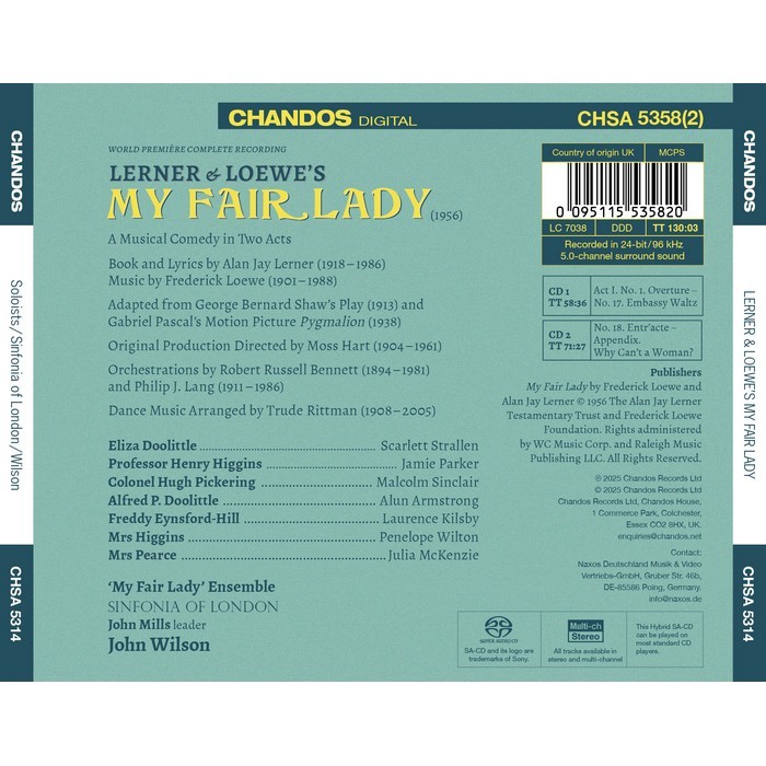 John Wilson comments: My Fair Lady is the quintessential American London musical. There is not a semiquaver or a semi-colon in the wrong place. Steven Wilkie, one of the fiddle players in my orchestra, describes it as The Marriage of Figaro of the twentieth century. And when I asked the great opera conductor Richard Bonynge what the finest post-World War Two operas are, he said, 'My Fair Lady, Oklahoma!... they're the great operas that will live on'. We have recorded every note, including underscoring, plus all the music written but cut before opening, with the instrumentation exactly as it was on opening night. Also, thanks to recent research, we have the restored original orchestrations. The reason I want to record everything the composer, lyricist, book-writer, and orchestrator did is that I believe it is a piece of significance by people who were masters of their art and craft. This was not written in an afternoon; it was chiselled away for months. They were ruthless in excising anything they felt would not make the grade. We have a duty to set down as closely as we can their final thoughts on what they created.