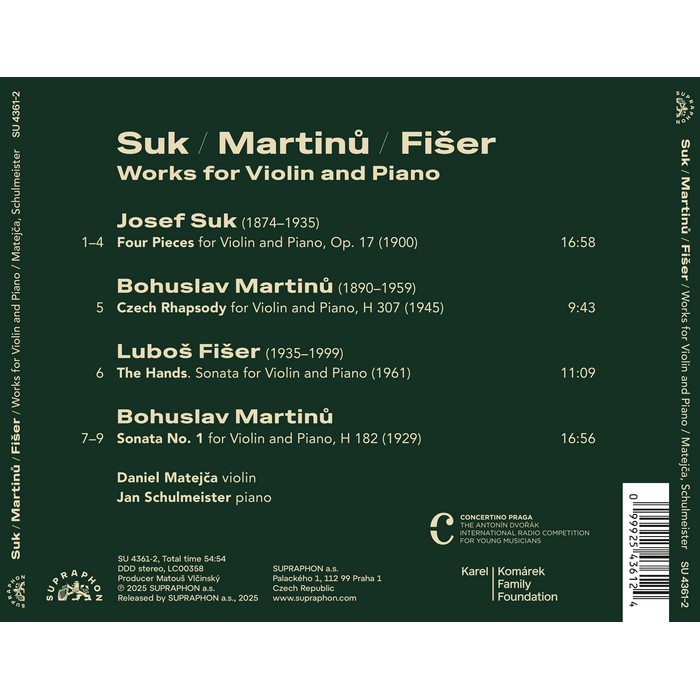 The Supraphon debut of 18-year-old Daniel Matejca (Ysaÿe – Violin Sonatas, 2023) has attracted great attention with critics around the world writing about his remarkable talent, comparing his recording with the very best. That same year, the 17-year-old pianist Jan Schulmeister came away from Texas with third prize at the prestigious Cliburn Junior Competition. And also that year, the Matejca – Schulmeister duo celebrated victory in the chamber music category at the competition Concertino Praga; that opened them the door to the studio for the making of this recording. Instead of brilliant, virtuosic show pieces, the young artists chose challenging Czech repertoire of the 20th century with pivotal works by Suk, Martinu, and Lubos Fiser. Martinu composed his Czech Rhapsody in the USA just after the end of the Second World War for Fritz Kreisler, who was 70 years old by then. Even today, this beautiful composition is a great technical challenge for the soloist. Martinu's First Violin Sonata (1929) still belongs to the composer's Paris period, as can be seen from jazz elements and the sometimes impressionistic mood of the piano part. The third composer, Lubos Fiser, is known mainly in his homeland, but his music also earned international awards (UNESCO prize, Prix d'Italia). His violin sonata The Hands was originally supposed to have been titled Crux, but that was completely unacceptable during the period of harsh communist rule. In the words of Ivan Straus, who premiered the sonata, "…the composition could be interpreted as a loose depiction of the Stations of the Cross at Easter with dramatic moments of whipping, hatred, and anxiety followed by a funeral procession (pizzicato) and then the glorious Resurrection in the concluding apotheosis to the sound of bells."