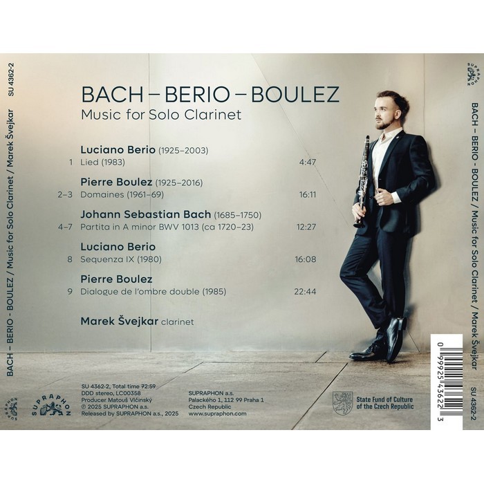 The clarinet is one of the instruments with the broadest spectrum of sonic possibilities in terms of its range of dynamics and pitches. It received the greatest attention during the era of Classicism both in solo parts in concertos and in the roles of a chamber music partner and an orchestral instrument. It had to wait until the 20th century for works featuring its unaccompanied solo voice in its full range of colours. Outstanding among the composers who created such works are two figures who fundamentally shaped musical thinking in the latter half of the 20th century: Luciano Berio and Pierre Boulez. Commemorating the 100th anniversaries of both men's birth, this recording covers their complete music for solo clarinet. Berio and Boulez sought new ways to organise music in time and space, and both took inspiration from poetry. Boulez gave symbolic expression to their quest: "It must be our concern…to jettison the concept of a work as a simple journey starting with a departure and ending with an arrival." One of the things that inspired Berio's idea of "polyphonic music for a monophonic instrument" were works by J. S. Bach. One of them, Partita in A minor for solo flute, is heard on this recording in juxtaposition with the modernism of the 20th century. Clarinettist Marek Svejkar is a laureate of the Premier Prix from Paris's prestigious Conservatoire National Superieur and the winner of multiple international competitions. Recognised for his musical sensitivity, he has appeared as soloist with leading ensembles including the Czech Philharmonic under Jirí Belohlavek and has been invited to collaborate with the Orchestre de Paris, Orchestra Nazionale di Santa Cecilia, Ensemble Intercontemporain, IRCAM, Opera di Limoges, and with the soloists of the Karajan Academy of the Berlin Philharmonic. A graduate of the legendary Alessandro Carbonare's class at the Accademia Nazionale di Santa Cecilia, he already seems to have his ticket to the European clarinet elite.