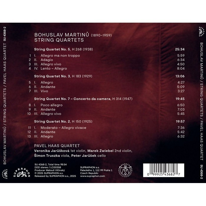 Pavel Haas Quartet, one of the very top ensembles on the worldwide chamber music scene, has been devoting itself to works for quartet by Bohuslav Martinu for a number of years and has given complete presentations of them, including a series of concerts at London's Wigmore Hall. Martinu's deep affinity for the quartet genre is evident throughout his oeuvre: "I can't tell you what pleasure I feel when working with those four voices… I somehow feel at home with the quartet, intimate, happy… Being independent, free, they do as they wish, and despite that, they create harmonious interplay, forming something, a new entity and a harmonic whole". For this recording, they have chosen the 2nd, 3rd, 5th, and 7th quartets – four widely different worlds that together create an exciting musical arch spanning more than two decades of the 20th century. The Second String Quartet was Martinu's breakthrough, earning him international attention, then in the Third the composer gave himself plenty of room for experimentation. The Fifth (Paris, 1938) is full of emotions and inner tension, while in the post-war Seventh (New York 1947), Martinu seems to have returned to Dvorakian romantic lyricism and melodiousness. In interpretations by the Pavel Haas Quartet, these works are heard with an new, unexpected intensity. Renowned for their rich, colourful sound, fascinating interplay, and feel for details, the Pavel Haas Quartet is able not only to understand Martinu's language, but also to communicate it convincingly and draw listeners into the inner world of one of the greatest Czech composers of the 20th century.