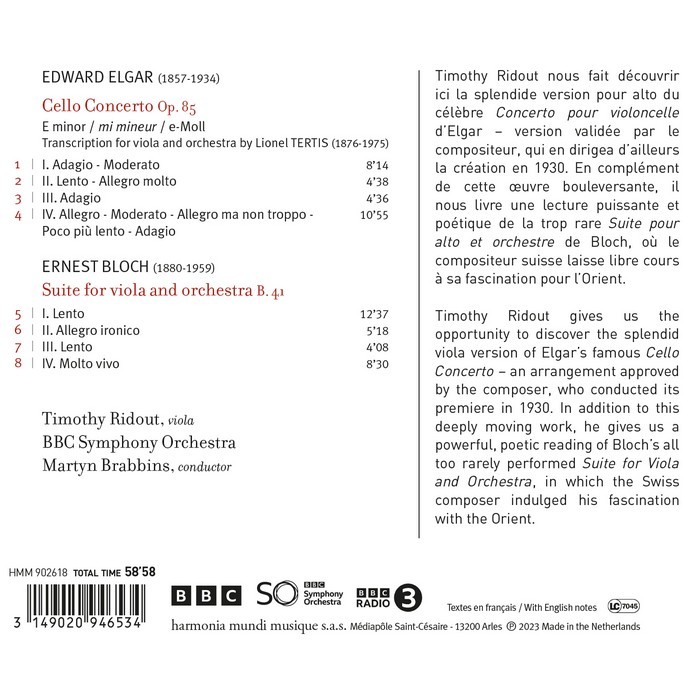 Timothy Ridout gives us the opportunity to discover the splendid viola version of Elgar's famous Cello Concerto – an arrangement approved by the composer, who conducted its premiere in 1930. In addition to this deeply moving work, he gives us a powerful, poetic reading of Bloch's all too rarely performed Suite for Viola and Orchestra, in which the Swiss composer indulged his fascination with the Orient.