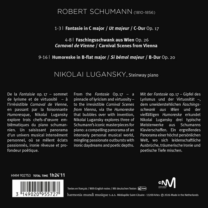 From the Fantasie Op. 17 – a pinnacle of lyricism and virtuosity – to the irresistible Carnival Scenes from Vienna, via the Humoreske that bubbles over with invention, Nikolai Lugansky explores three of Schumann's iconic masterpieces for piano: a compelling panorama of an intensely personal musical world, mingling passionate outbursts with ironic daydreams and poetic depths.