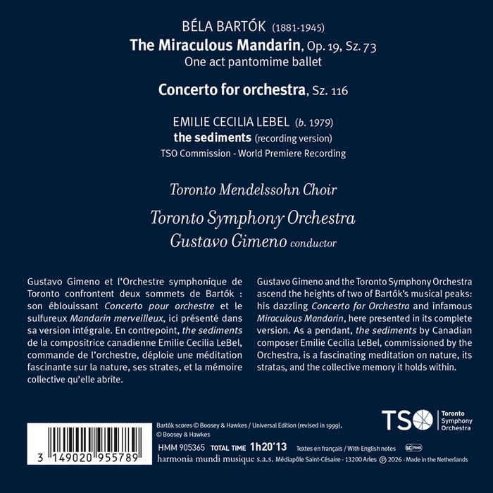 Gustavo Gimeno and the Toronto Symphony Orchestra ascend the heights of two of Bartok’s musical peaks: his dazzling Concerto for Orchestra and infamous Miraculous Mandarin, here presented in its complete version. As a pendant, the sediments by Canadian composer Emilie Cecilia LeBel, commissioned by the Orchestra, is a fascinating meditation on nature, its stratas, and the collective memory it holds within.