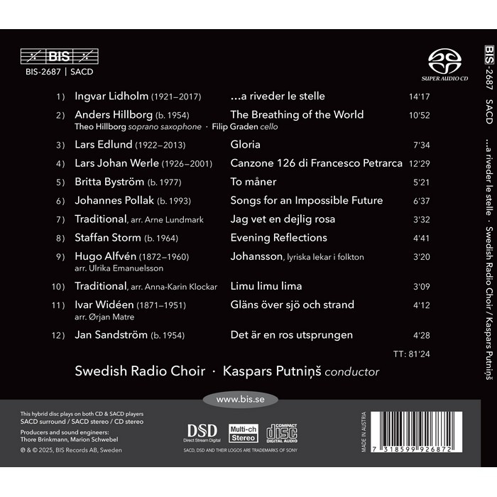 The programme features twelve extremely varied works. demonstrating the openness. versatility and flexibility of the Swedish Radio Choir and its multi-award-winning conductor. Kaspars Putnins. It also pays tribute to the pioneering work of the choir's long-standing choirmaster