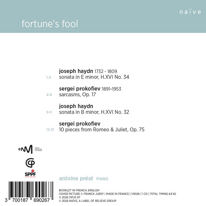 The choice of these two composers is also a matter of the heart. A passionate devotee of the Russian repertoire, Antoine Preat has been performing Prokofiev’s Romeo and Juliet ballet since the age of twelve. It is from this work that the album takes its title, Fortune’s Fool, a quotation from Shakespeare’s eponymous tragedy. Preat also enjoys performing Haydn, particularly on the fortepiano and in trio settings. His clear and luminous playing reveals his experience with historical keyboards - he studied both harpsichord and fortepiano - bringing an immediate clarity to these contrasting pages, which shift between a sometimes nave charm and an orchestral breadth.