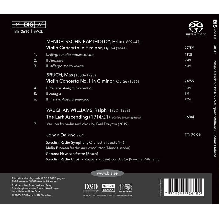Felix Mendelssohn's Concerto in E minor needs no introduction: this masterpiece from the composer's mature period is one of the best known and most beloved works in all of classical music thanks to its freshness. originality of writing. and magnificent themes. Max Bruch's First Violin Concerto. another pillar of the violin repertoire. is appreciated for its natural lyricism and memorable melodies. In these two works. Johan Dalene is accompanied by the Swedish Radio Symphony Orchestra. conducted by its concertmaster Malin Broman (Mendelssohn) and by Gemma New (Bruch). Imbued with a serene. meditative spirit and a sense of communion with nature. Ralph Vaughan Williams' The Lark Ascending concludes the program. However. the work is not performed here in its well-known orchestral version. but rather with choir in an arrangement by Paul Drayton. The Swedish Radio Choir is conducted by its director Kaspars Putnins. a musical partnership whose recordings on BIS have earned numerous awards.
