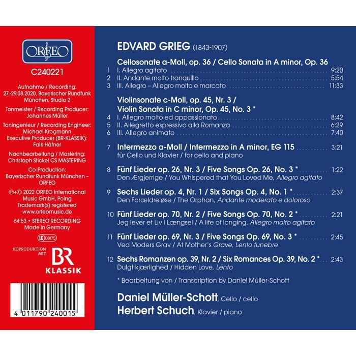 Edvard Grieg, arguably the most popular composer ever to emerge from the Scandinavian Peninsula, made a substantial contribution to the chamber music canon with his violin sonatas, rather than his works for cello; he in fact wrote only one cello sonata, his Op. 36. This all-Grieg album is Daniel Muller-Schott’s twentieth on the Orfeo label and again reflects his commitment to expanding the repertoire for his instrument, not least through his facility for making transcriptions; the programme includes the premiere recording of his transcription for cello of Grieg’s Violin Sonata in C minor, Op. 45, No. 3. Accompanied by pianist Herbert Schuch, his long-standing duo-partner, the remainder of their programme comprises the short Intermezzo in A minor (EG 115) and five further contrasting transcriptions of short songs and the Romance, Op. 39, No. 2.