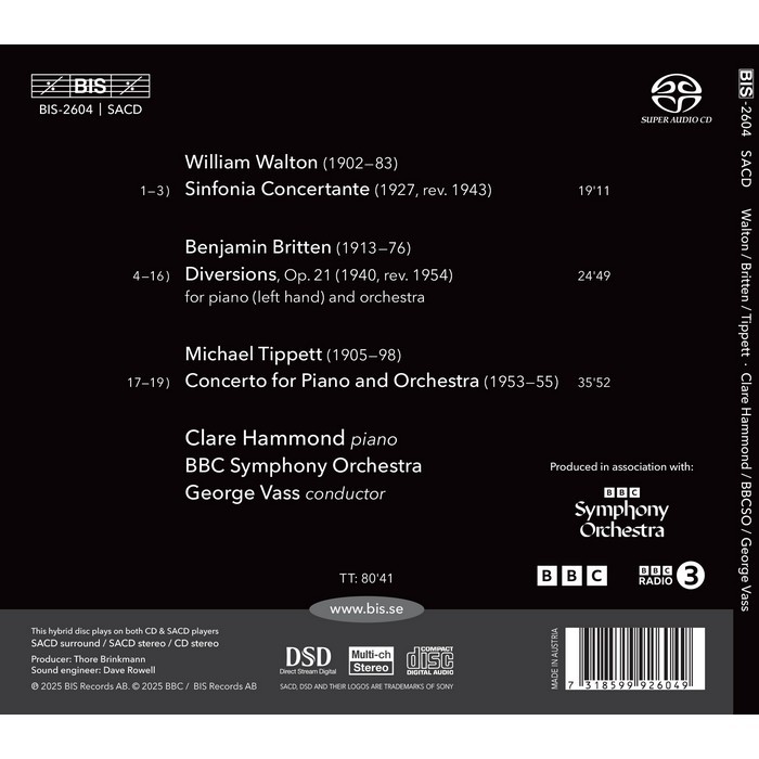 Three major works for piano and orchestra by English composers, all eschewing the traditional nineteenthcentury model of a bravura virtuoso soloist pitted against an orchestra, in distinctive ways. Together with the BBC Symphony Orchestra under George Vass, Clare Hammond presents an original programme that provides a unique perspective on how the piano concerto reflected musical currents in mid-twentiethcentury Britain.