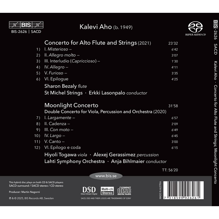 This recording is dedicated to two recent concertos by Kalevi Aho, one of Finland's foremost contemporary composers. The author of a body of work as important as it is varied, Aho enjoys collaborating with exceptional soloists, for whom he composes works that highlight their musical qualities, inventiveness and personality. The Concerto for Alto Flute and Strings features an instrument with a soft tone, well suited as a soloist with a small orchestra of strings alone. The work is in six movements played without interruption, and the soloist, Sharon Bezaly, sometimes switches to the bass flute, which brings a mystical feel to the music. The St Michel Strings and their conductor, Erkki Lasonpalo, contribute to the mysterious atmosphere in which lyrical and dramatic episodes abound.