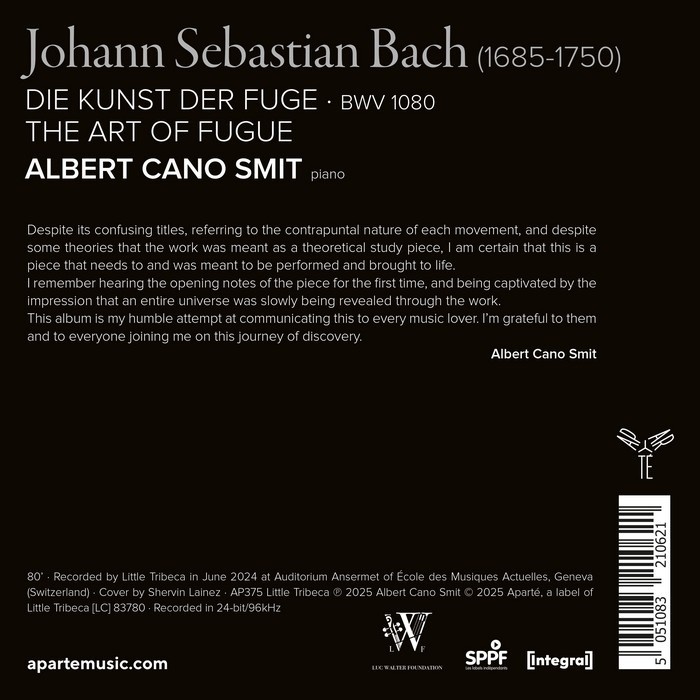 Nourished by this teaching, Albert Cano Smit chose the ultimate achievement in this field, L'Art de la fugue, for his first solo album.