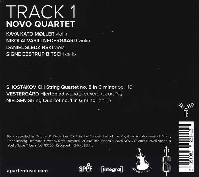 NOVO Quartet – like novo, "new." The name reflects the curiosity and spirit of discovery that has already carried these four musicians, trained by Tim Frederiksen, to the podiums of the Geneva and Carl Nielsen competitions. Their debut album, Track 1, returns to their roots: Shostakovich's String Quartet No. 8, the very first piece they studied together; HJERTEBLAD (literally "heart-leaf," the seed's first leaf) by Matias Vestergaard, which opened the door to contemporary repertoire; and Carl Nielsen's First Quartet, a tribute to the "great Danish hero" and the starting point of an upcoming complete cycle.
