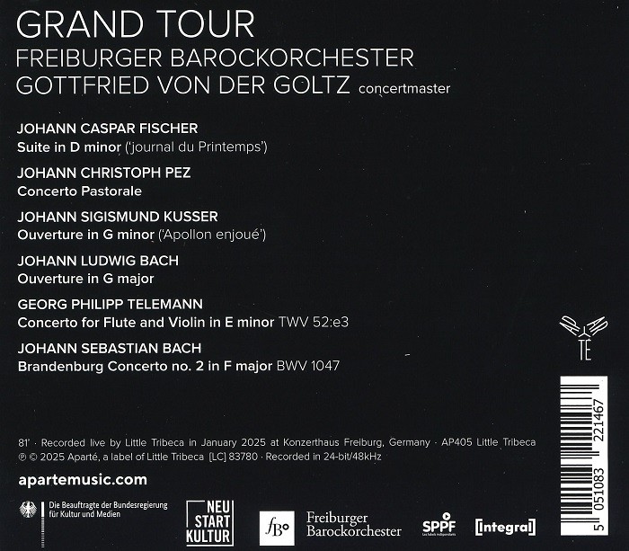 In this new live recorded album, the FBO recreates that musical journey, stopping in Rastatt, Stuttgart, and Eisenach. Alongside the great names of Telemann and Johann Sebastian Bach – with a double concerto for flute and violin and the Second Brandenburg Concerto – listeners will discover splendid works by lesser-known composers: Fischer and Kusser, bridging towards the French style; Pez and his Concerto Pastorale, looking towards Italy; and the Ouverture by Johann Ludwig Bach, the elder cousin admired by the illustrious Johann Sebastian