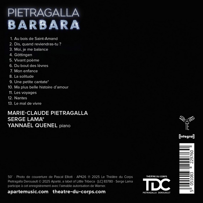 From her show Pietragalla Barbara then arose the thirst to delve further into the fragile and incandescent world of the "Lady in Black." This path, patiently traversed in the solitary complicity of creation, now finds its setting in the sensitive and luminous piano of Yannael Quenel, and is illuminated by an unforgettable duet with Serge Lama.