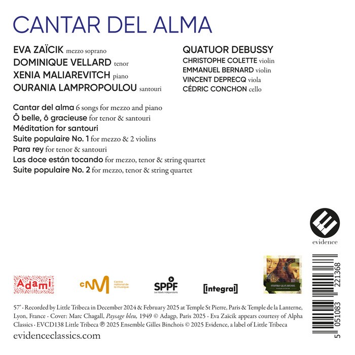 The new album by Ensemble Gilles Binchois is dedicated to the works of its founder and director, Dominique Vellard. In Cantar del alma, he interweaves his own compositions – mostly vocal – with his arrangements of traditional music, drawn largely from the rich heritage of the Mediterranean basin. He is joined by Eva Zaicik, the Quatuor Debussy, Ourania Lampropoulou on santouri, and Xenia Maliarevitch on piano.
