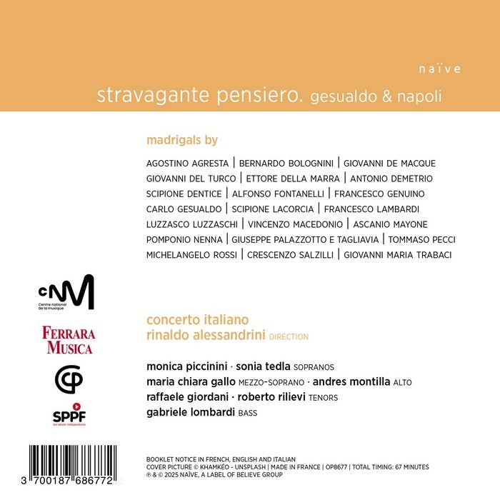 With Stravagante pensiero, Rinaldo Alessandrini hardly goes any further. In this new chapter documenting the madrigal genre, the Roman musician takes from the master of Venosa only the intriguing Asciugate i begl’occhi (Book V). On this new recording the five singers revel in its harmonic slippings and slidings.