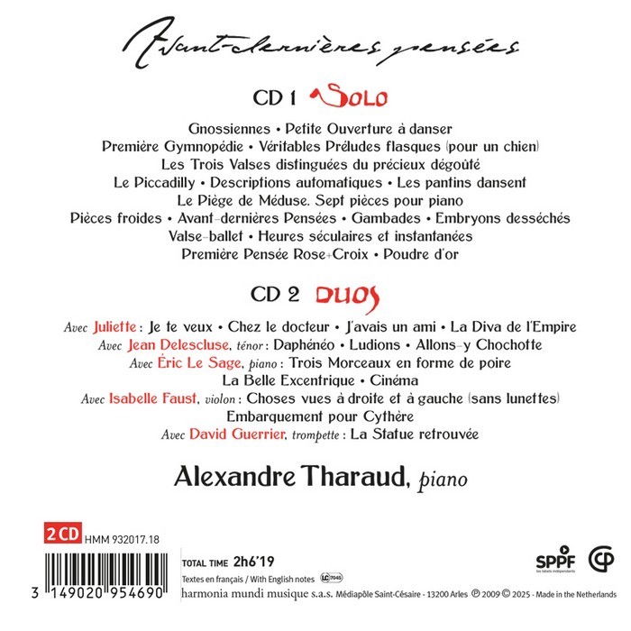 More than fifteen years ago, Alexandre Tharaud gathered together several like-minded celebrity artists to paint a sensitive and subtle portrait of the Master of Arcueil. This re-release revives that double album, one that has since become a benchmark of Satie discography, with more than 150 million streams! Here is a poetic voyage through the singular world of a composer who remains unclassifiable.