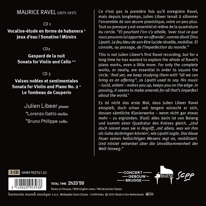 This is not Julien Libeer's first Ravel recording, but for a long time he has wanted to explore the whole of Ravel's piano works, even a little more. For only the complete works, or nearly, are essential in order to square the circle. 'And yet, we keep studying them with “all we can bring as an offering”, as Lipatti used to say. His music - lucid, ardent - wakes you up, keeps you on the edge. In passing, it seems to make amends for all that's imperfect about the world.'
