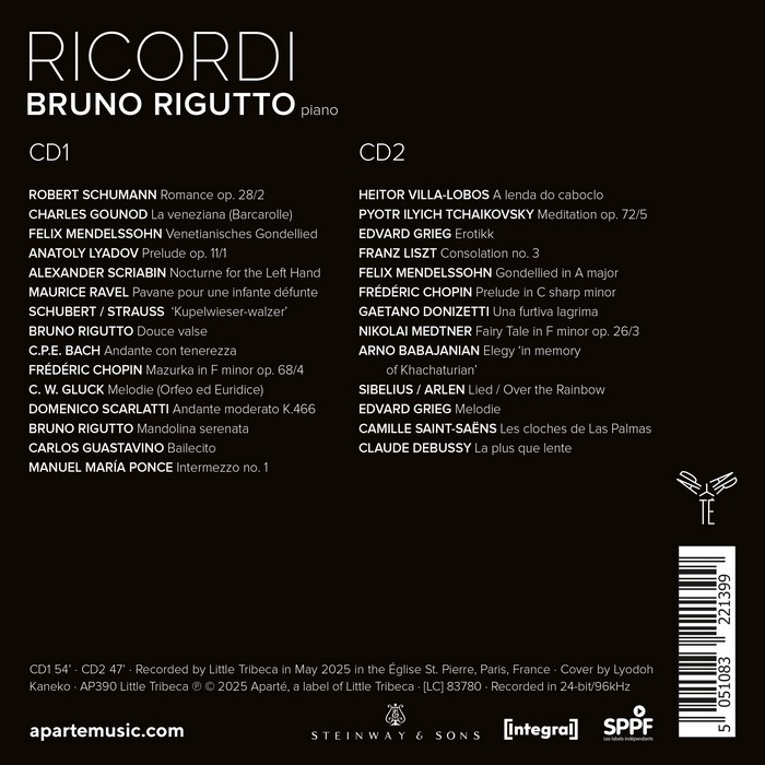 CD1 1. ROBERT SCHUMANN Romance in F sharp major (3 Romanzen, op. 28/2) 3'07 2. CHARLES GOUNOD La veneziana (Barcarolle) CG 593 3'16 3. FELIX MENDELSSOHN Venetianisches Gondellied (Lieder ohne Worte, op. 62/5) 2'38 4. ANATOLY LYADOV Prelude (3 Morceaux, op. 11/1) 2'36 5. ALEXANDER SCRIABIN Nocturne for the Left Hand op. 9/2 4'37 6. MAURICE RAVEL Pavane pour une infante defunte M.19 5'49 7. FRANZ SCHUBERT Waltz in G flat major D.Anh.I/14 'Kupelwieser-walzer' 2'40 transc. Richard Strauss 8. BRUNO RIGUTTO Douce valse 2'53 9. CARL PHILIPP EMANUEL BACH Andante con tenerezza (Sonata in A major, Wq. 65/32) 4'55 10. FREDERIC CHOPIN Mazurka in F minor op. 68/4 3'23 11. CHRISTOPH WILLIBALD GLUCK Melodie (Orfeo ed Euridice) 2'51 arr. Sgambati 12. DOMENICO SCARLATTI Andante moderato (Sonata in F minor, K.466) 5'10 13. BRUNO RIGUTTO Mandolina serenata 4'51 14. CARLOS GUASTAVINO Bailecito 3'06 15. MANUEL MARÍA PONCE Intermezzo no. 1 2'21 CD2 1. HEITOR VILLA-LOBOS A lenda do caboclo W166, 188 3'23 2. PYOTR ILYICH TCHAIKOVSKY Meditation op. 72/5 4'54 3. EDVARD GRIEG Erotikk (Lyric Pieces, op. 43/5) 2'43 4. FRANZ LISZT Consolation no. 3 S.172 3'46 5. FELIX MENDELSSOHN Gondellied in A major WoO 10; MWV U 136 2'11 6. FREDERIC CHOPIN Prelude in C sharp minor op. 45 4'07 7. GAETANO DONIZETTI Una furtiva lagrima 3'55 arr. Hans Gunther Heumann 8. NIKOLAI MEDTNER Fairy Tale in F minor op. 26/3 2'38 9. ARNO BABAJANIAN Elegy 'in memory of Khachaturian' 3'29 10. JEAN SIBELIUS / HAROLD ARLEN Lied (6 Bagatelles, op. 92/2) / Over the Rainbow 6'28 11. EDVARD GRIEG Melodie (Lyric Pieces, op. 47/3) 2'31 12. CAMILLE SAINT-SAËNS Les cloches de Las Palmas (6 Etudes, op. 111/4) 4'03 13. CLAUDE DEBUSSY La plus que lente L 128a 4'04 Bruno Rigutto piano |