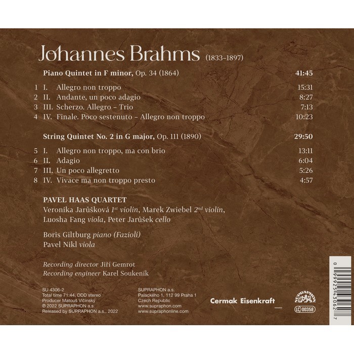 Their recording of the American Quartet and String Quartet No. 13, Op. 106 (Gramophone Award - Recording of the Year), elevated the Pavel Haas Quartet among the finest performers of Antonin Dvorak's music. This position was subsequently confirmed by a recording of the composer's quintets, made with the violist Pavel Nikl, a founding member of the ensemble, and the pianist Boris Giltburg, winner of the Queen Elisabeth Competition. The album received the most coveted classical music accolades (Gramophone Chamber Award, BBC Radio 3 Record Review Discs of the Year, Diapason d'Or, etc.). While recording the Dvorak quintets, the logical idea of a Brahms album was born. And now it has come to fruition. Dvorak was encouraged by and ultimately attained global fame owing to the kind support and friendship of his older colleague Brahms, who in his twenties had been just as generously aided by Clara and Robert Schumann. Brahms' relationship with Clara is probably also behind the Piano Quintet in F minor, Op. 34. Originally conceived as a string quintet, in the spring of 1864 Brahms transformed it into a sonata for two pianos, yet Clara voiced her doubts about this version's sound too. The desired contrast and richness of colour was ultimately achieved by combining the strings and the piano. Clara Schumann performed the piano part at the private premiere of the quintet, which she referred to as having "symphonic" proportions. This aspect is clearly foregrounded on the present Pavel Haas Quartet recording. Brahms allegedly intended the String Quintet in G major, Op. 111, to be his last piece of music. In this light, it may come across as a reflection of the music he had cherished during his life - from Beethoven, Schubert, the Viennese waltz, his contemporary Wagner, to his beloved Hungarian dance motifs.